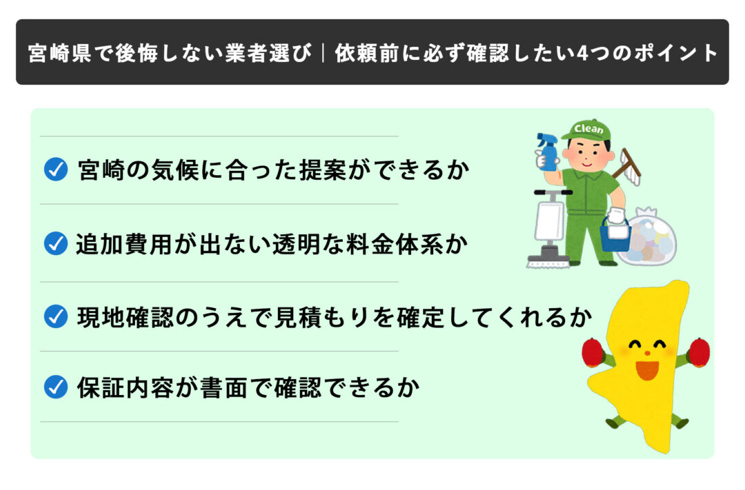 業者を選ぶ際は、「宮崎の気候を踏まえた提案ができるか」「料金の分かりやすさ」「見積もりの根拠」「保証内容」を確認しておくと安心です。