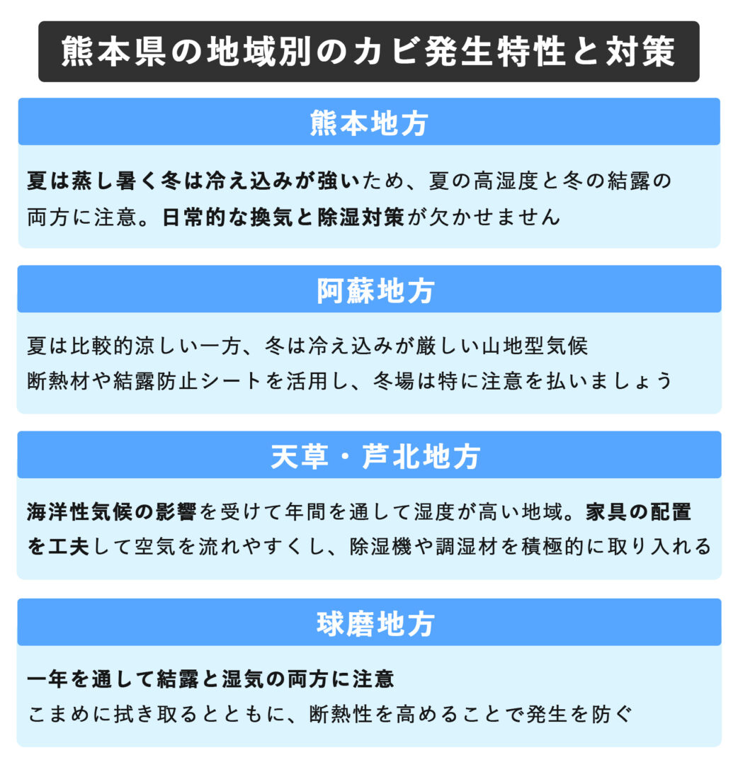 熊本県は地域ごとに気候が異なり、夏の蒸し暑さや冬の結露、沿岸部の海風などがカビの発生を後押しします。
