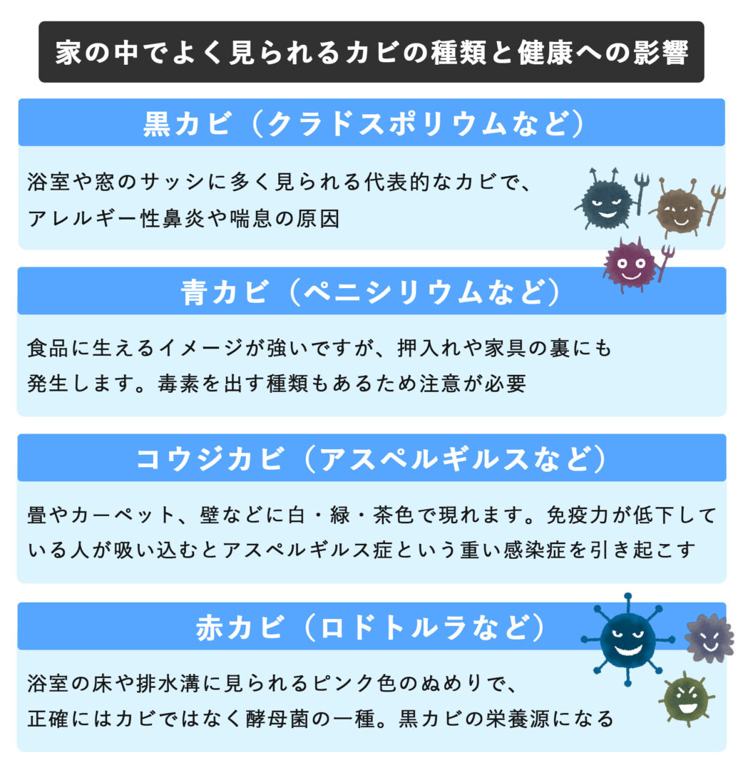 家庭でよく発生するカビにはいくつか種類があり、それぞれ特徴や健康リスクが異なります。