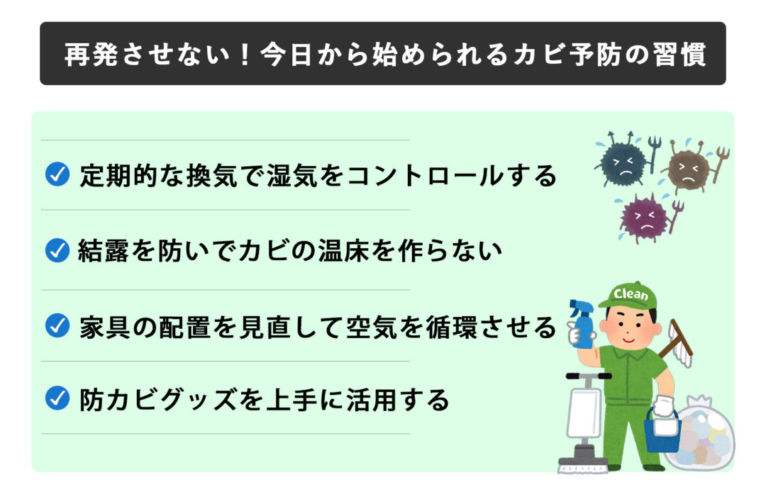 そして、カビ取りが終わったあとも油断せず、日々の換気や結露対策、通気の工夫などの小さな習慣を続けましょう。