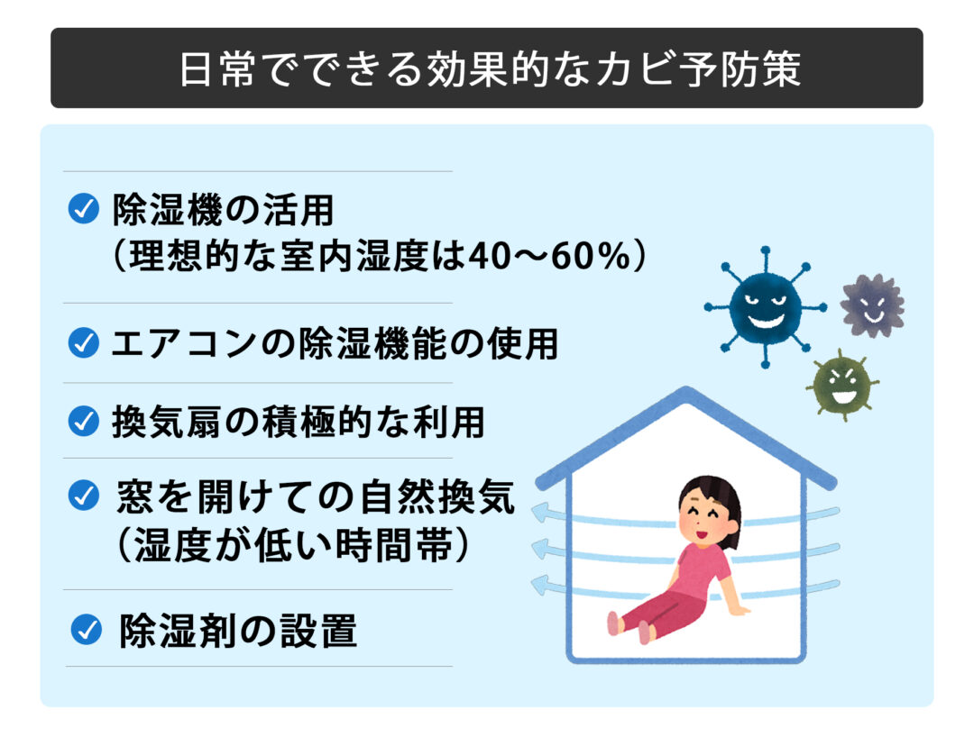 特に夏場は湿度が高く、室内でもカビが繁殖しやすくなるため、季節ごとの特徴を理解し、適切な対策を行うことが大切です。