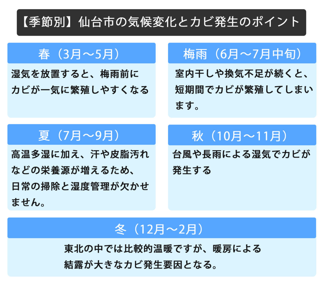 仙台市は夏は蒸し暑く、冬は乾燥や結露が生じやすいなど、一年を通してカビが発生しやすい気候特性を持っています。