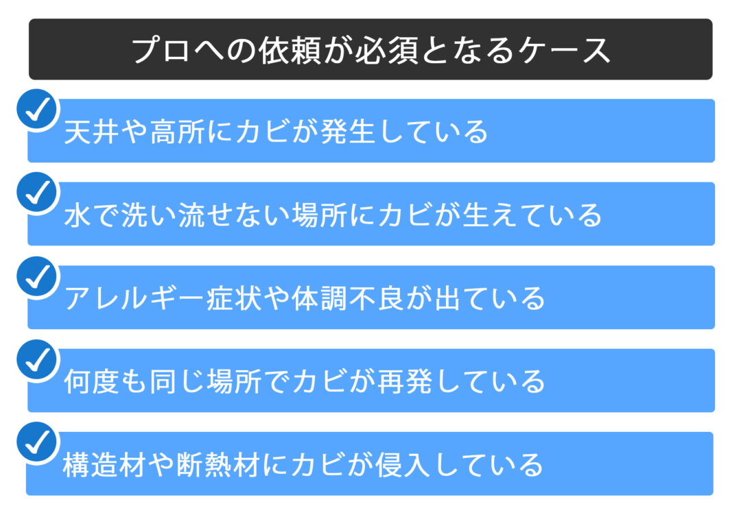 軽度のカビであれば自力での対処も可能ですが、範囲が広い場合や再発を防ぎたい場合にはプロに依頼するのが確実です。