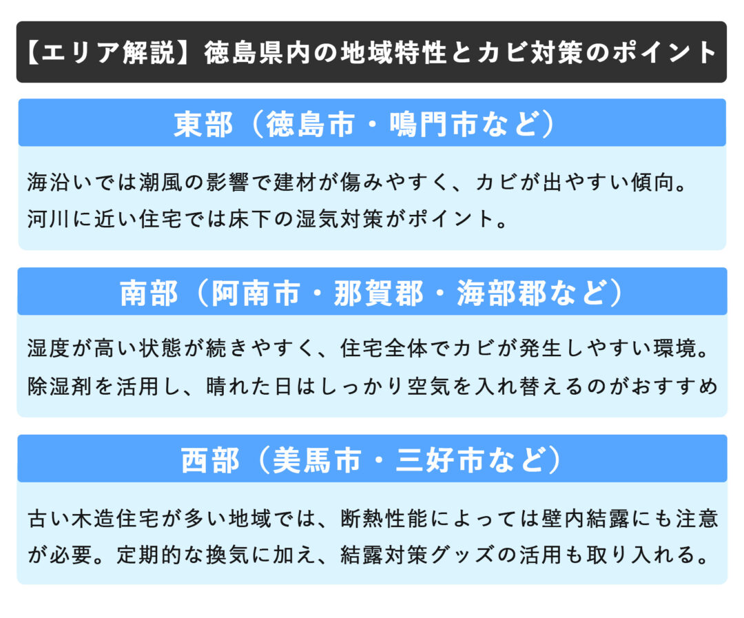 徳島県は地形や気候の違いから、エリアによってカビの発生傾向が変わります。