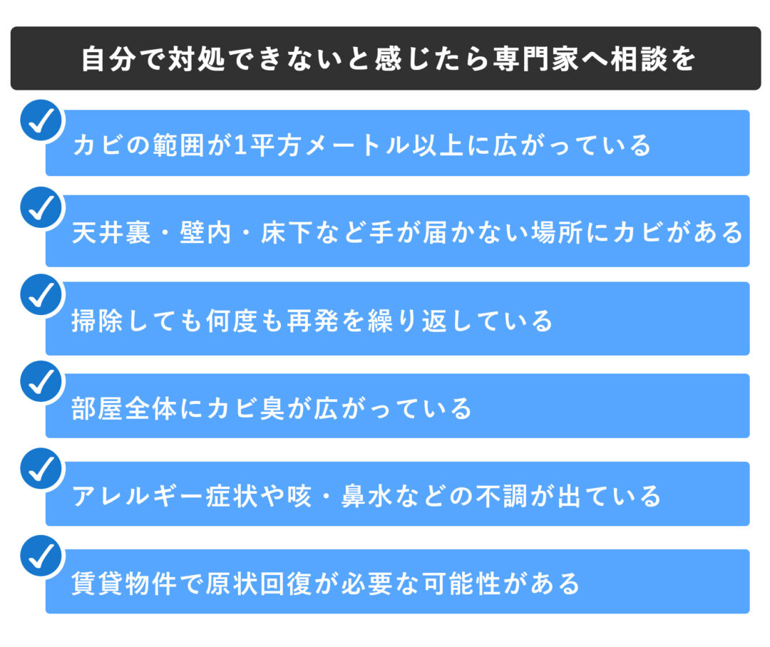 カビは一度発生すると短期間で広がりやすく、自己判断で対処するとかえって状況を悪化させてしまう場合があります。