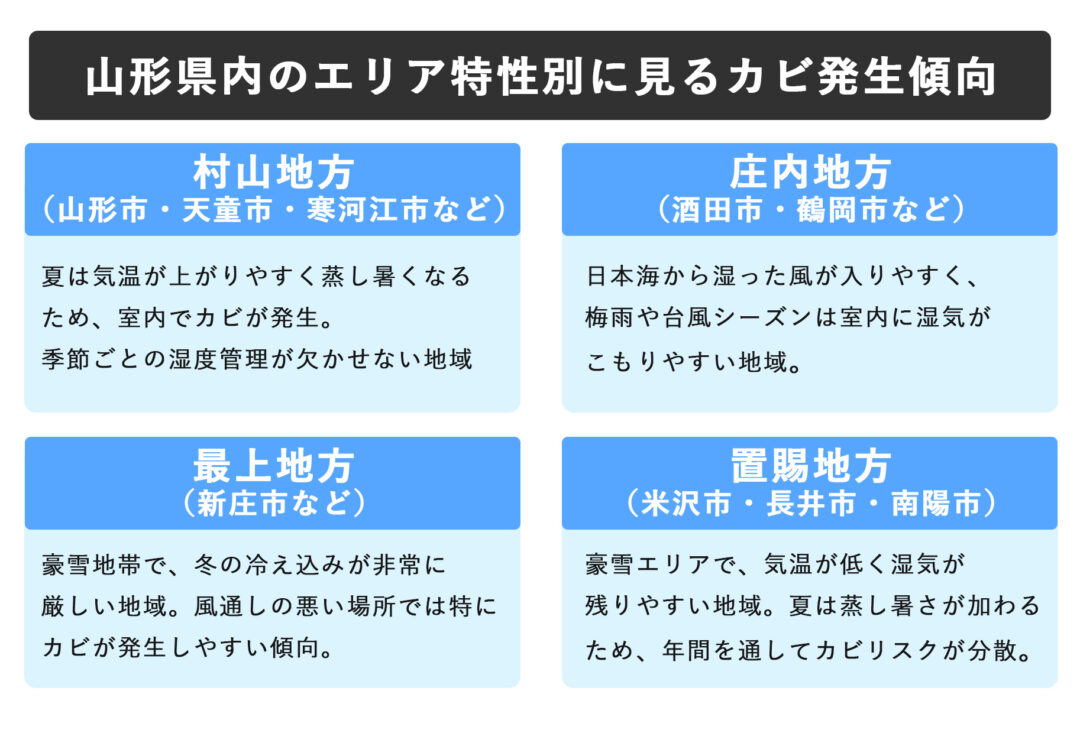 山形県は、村山地方・庄内地方・最上地方・置賜地方の4つの地域で気候が大きく異なり、カビが発生しやすい条件にも違いがあります。