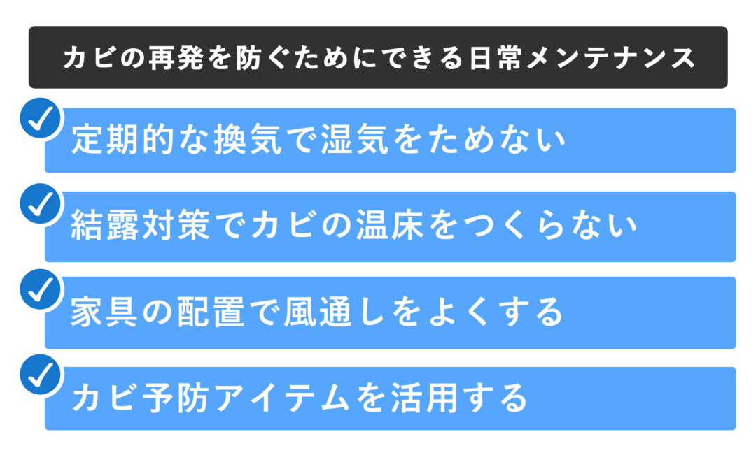 カビは環境の変化で再発することもあるため、以下の内容は必ずチェックしておきましょう。